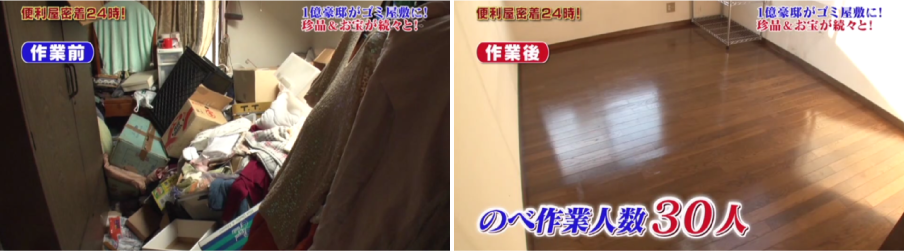 汚部屋・ゴミ屋敷・ゴミマンションも遠慮なくお任せください!年間約100件の経験と実績、資格を持ったスタッフが収納のアドバイスもさせて頂きながらクリーニングを行います!